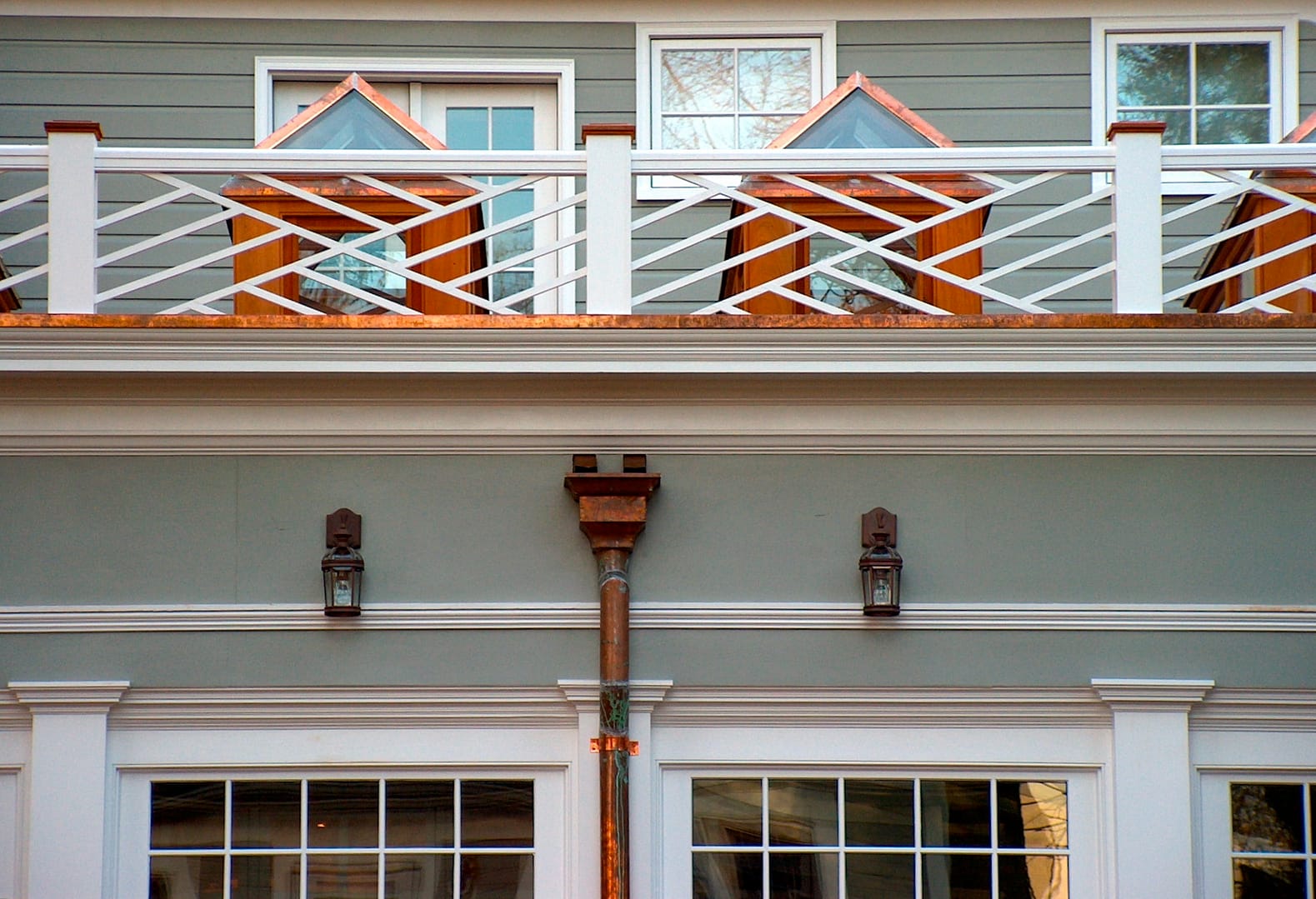 This sunroom is a beautiful, bright space. The challenge thrown at us on this project was building elevated custom skylights on the upper level of mahogany, copper and glass, on a flat deck. The roof was flat seamed copper, and we laid mahogany deck boards on top.